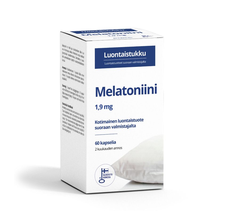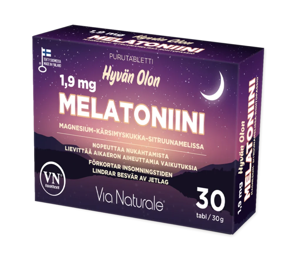 • Miedompi 1 mg melatoniinitabletti, joka tukee nukahtamista ja aikaerorasituksen hallintaa.